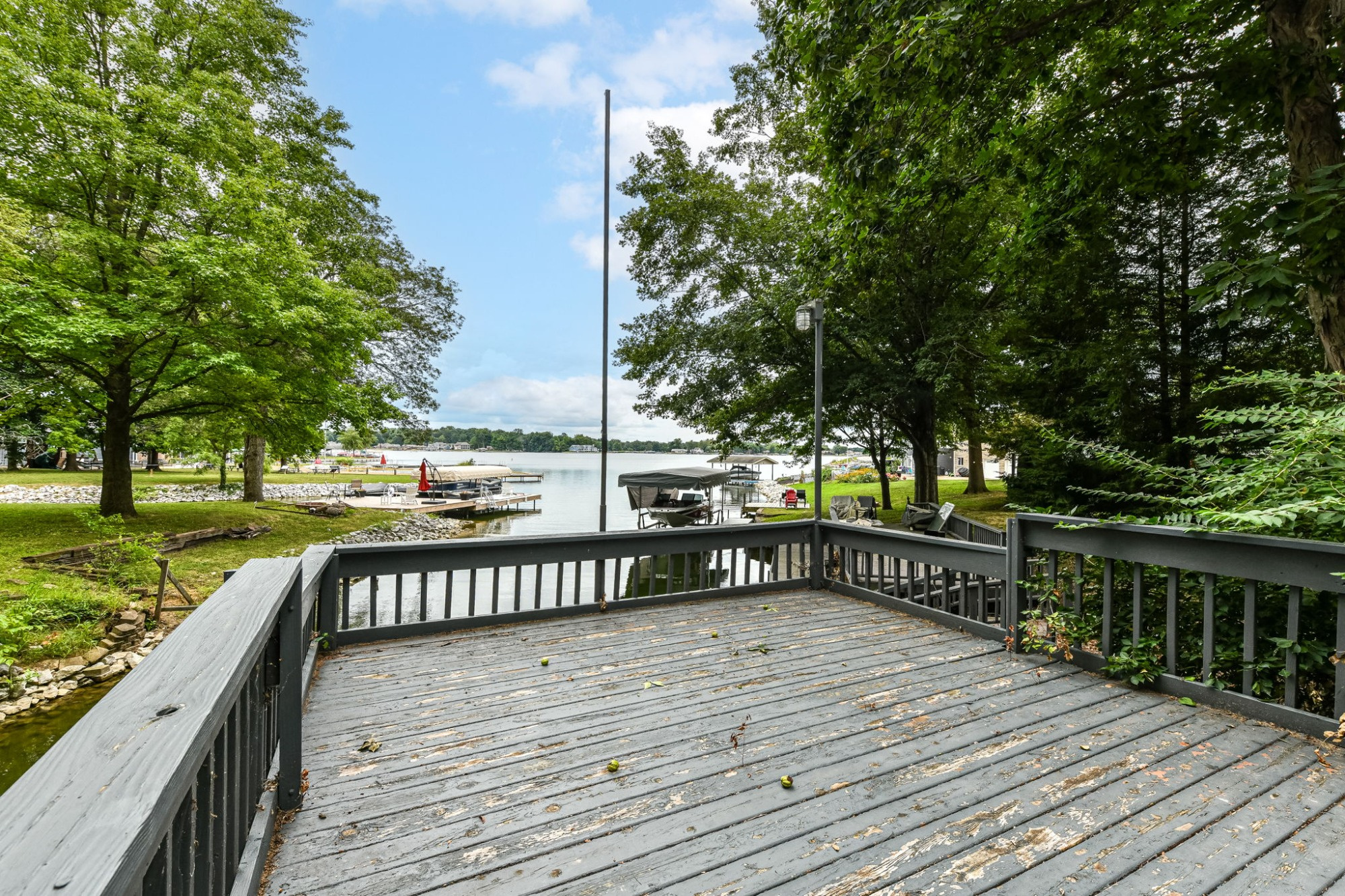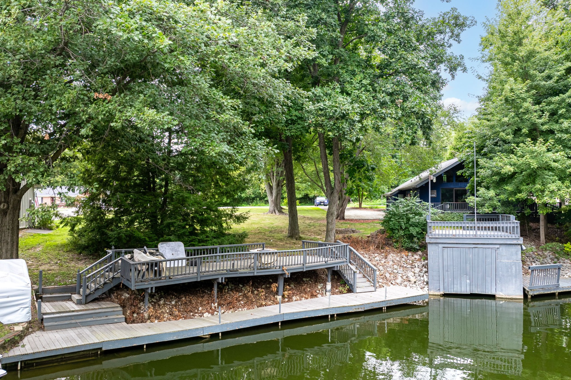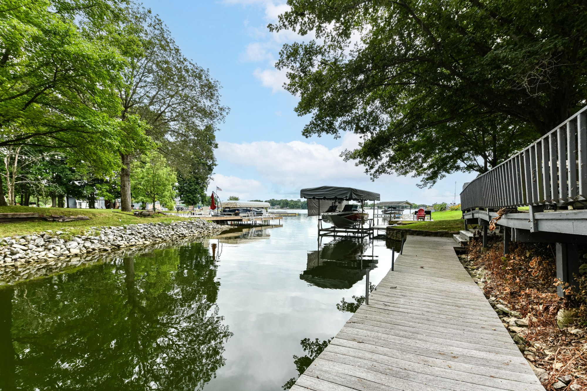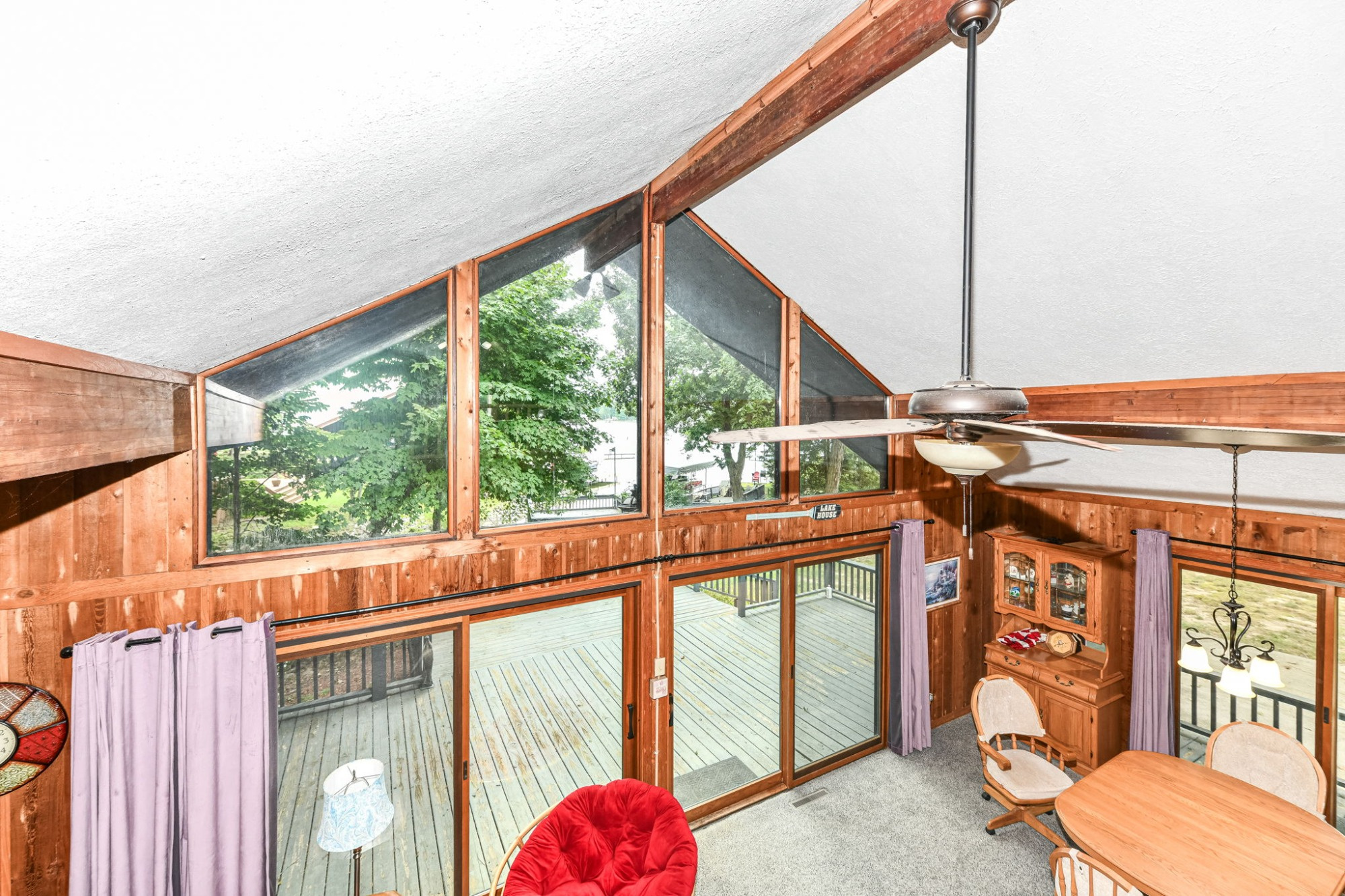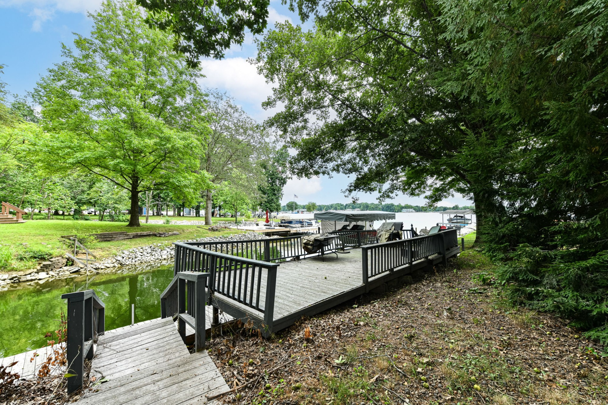 Endless opportunities await with this A-frame lakehome at Heritage Lake! Featuring 2 bedrooms plus a loft for extra living space, this home boasts soaring ceilings and a spacious wrap-around deck where you can take in sweeping views of the main body of the lake. The great room, anchored by a beautiful masonry fireplace, is the perfect spot to enjoy a cozy fire on cold winter nights and flows seamlessly into the small kitchen and wet bar area-ideal for entertaining while still enjoying the lake views. The primary suite includes a charming nook that's perfect for a home office or reading corner. Situated on a combined .58 acres with 70 feet of lakefront, this property offers plenty of space to spread out and enjoy lake life. The oversized 2-car garage provides ample room for vehicles, a generous workshop area, and storage for your golf cart-a must in this fun golf cart-friendly community. Even more unique, the property features a grandfathered-in boat garage topped with a spacious observation deck-perfect for entertaining, relaxing, or soaking in sunsets over the water. With the adjoining lot included, you'll have endless potential to remodel, expand, or even design a brand-new lake retreat. Being sold as-is, this home is an incredible value for buyers ready to create their dream getaway at Heritage Lake.