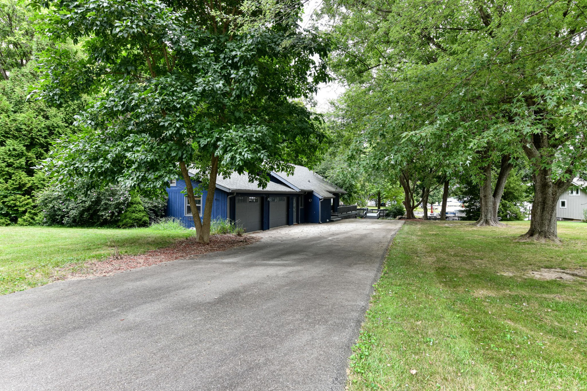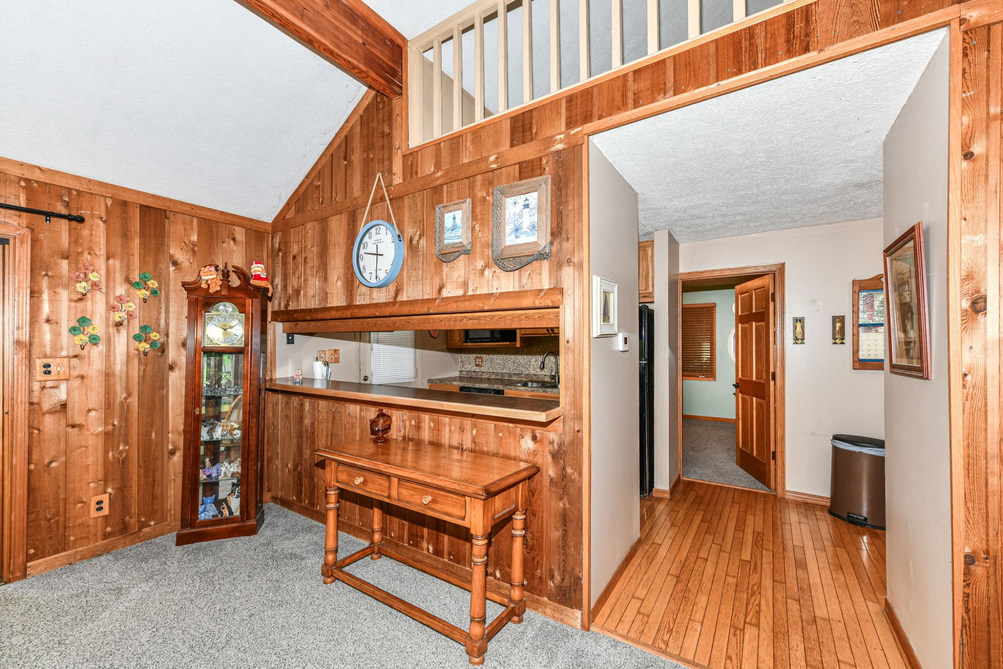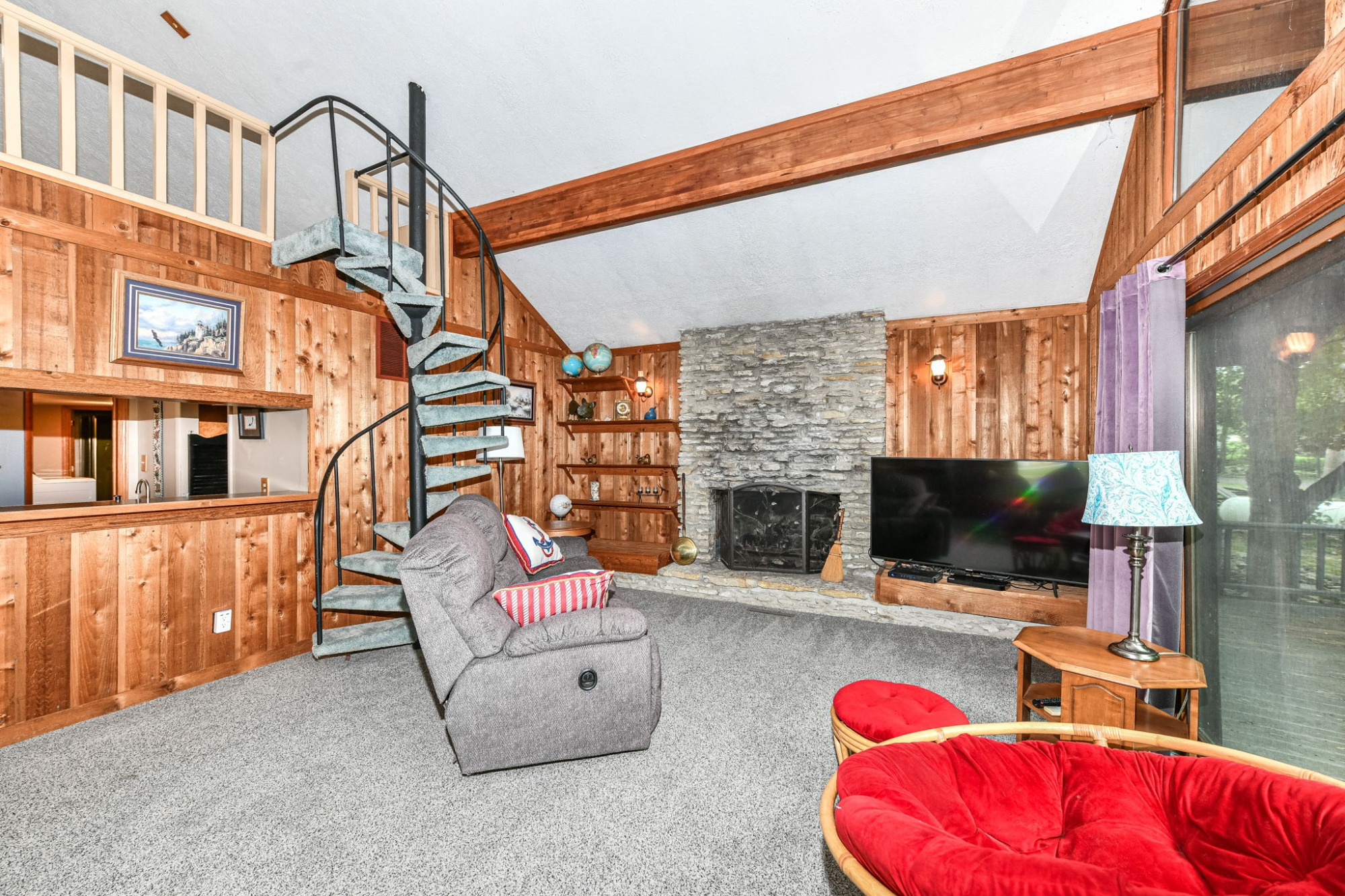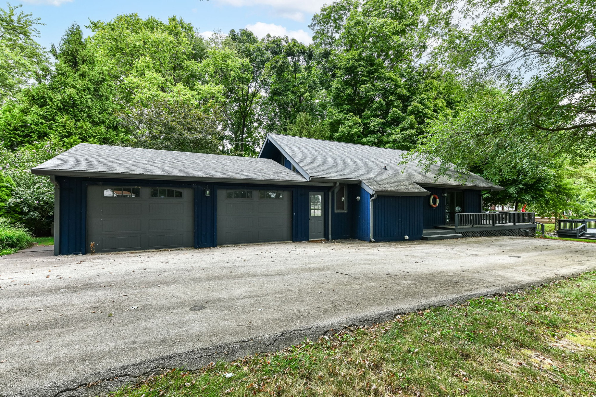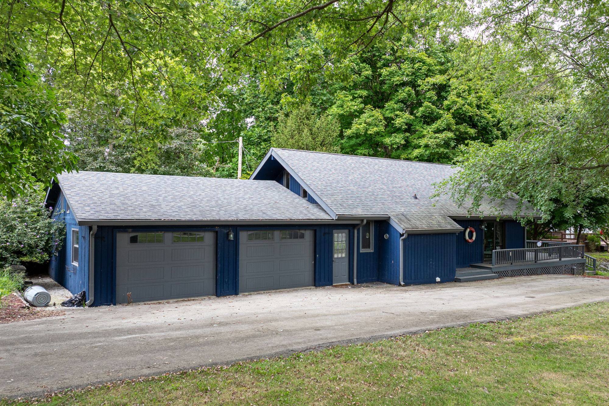 Endless opportunities await with this A-frame lakehome at Heritage Lake! Featuring 2 bedrooms plus a loft for extra living space, this home boasts soaring ceilings and a spacious wrap-around deck where you can take in sweeping views of the main body of the lake. The great room, anchored by a beautiful masonry fireplace, is the perfect spot to enjoy a cozy fire on cold winter nights and flows seamlessly into the small kitchen and wet bar area-ideal for entertaining while still enjoying the lake views. The primary suite includes a charming nook that's perfect for a home office or reading corner. Situated on a combined .58 acres with 70 feet of lakefront, this property offers plenty of space to spread out and enjoy lake life. The oversized 2-car garage provides ample room for vehicles, a generous workshop area, and storage for your golf cart-a must in this fun golf cart-friendly community. Even more unique, the property features a grandfathered-in boat garage topped with a spacious observation deck-perfect for entertaining, relaxing, or soaking in sunsets over the water. With the adjoining lot included, you'll have endless potential to remodel, expand, or even design a brand-new lake retreat. Being sold as-is, this home is an incredible value for buyers ready to create their dream getaway at Heritage Lake.
